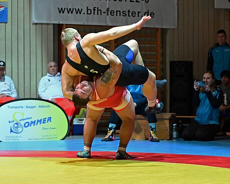 Wer aber dachte, damit wäre die Messe schon gelesen, hatte sich getäuscht. Die Stärke der Gäste liegt vor allem in der zweiten Runde. So konnte Johannes Fischer seinen zweiten Kampf des Abends gleich auf Schulter gewinnen. Danach holte sich zwar Alfredo Santangelo seinen zweiten Punktsieg, jedoch schlug anschließend die Stunde der Oberländer. Wie zu erwarten, fuhren Mustafa Karaismailoglu, Altmeister Peter Vierke und Clemens Seidler jeweils 4 Punkte ein. Damit war der komfortable Vorsprung vor dem letzten Duell auf nur noch 2 Punkte geschmolzen. Jedoch ließ hier Robert Schneider in seinem zweiten Auftritt nichts anbrennen. In seiner Paradedisziplin Griechisch-Römisch zeigte er seinem jungen Kontrahenten Catalin Nichita von Anfang an, wer als Sieger von der Matte gehen würde. Und so stand noch in der 1. Runde der technisch überlegene Punktsieg fest.