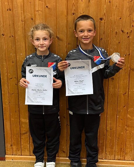Zwei Medaillen gab es in der Gewichtsklasse bis 24 kg. Carlo Santangelo und Hanna Hofer mussten sich jeweils nur dem Tagessieger aus Remseck (Baden-Württemberg) geschlagen geben, die anderen drei Gegner konnten beide besiegen. Beim vereinsinternen Duell um Silber hatte dann Carlo die Nase vorn. Auf dem Siegertreppchen freuten sich aber natürlich beide über ihre Medaillen.