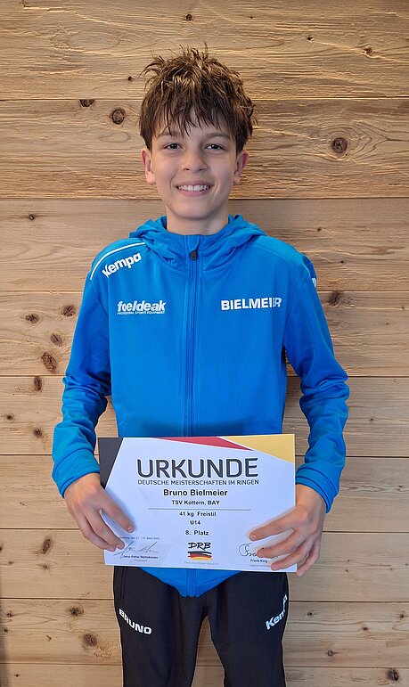 Ladenburg - Als zweifacher dritter Bayerischer Meister wurde Bruno Bielmeier vom TSV Kottern-Ringen Anfang März zum Vorbereitungslehrgang der U14 in die Sportschule Oberhaching eingeladen. Dort konnte er die Landestrainer durch gute Trainingsleistungen überzeugen, so dass er erstmals zu den Deutschen Meisterschaften der U14 im freien Stil nach Ladenburg eingeladen wurde. Und das, obwohl er noch zum jüngeren Jahrgang gehört.